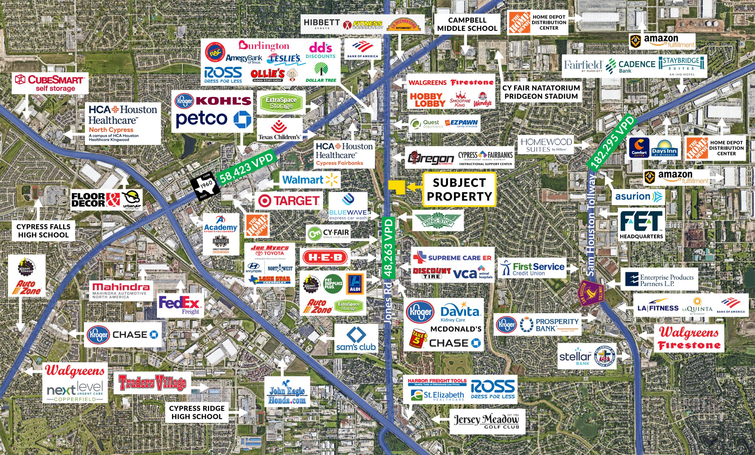 Linh Dao City Centre and Linh Dao Plaza are located on Jones Road with high traffic counts exceeding 48,286 vehicles per day. The subject property is in a dense retail trade area, near neighboring national and regional retailers including H-E-B, Family Dollar, Discount Tire, Kroger, ALDI, Planet Fitness, McDonald’s, Take 5 Oil Change, Ollie’s Bargain Outlet, Goodwill, Ross Dress for Less, Dollar Tree, EZPawn, Metro by T-Mobile, Walmart Supercenter, Target, The Home Depot, and many more. The subject property is also in close proximity to major employers such as Toshiba International Corporation, providing a daytime employment population of approximately 153,220 people within a five-mile radius.